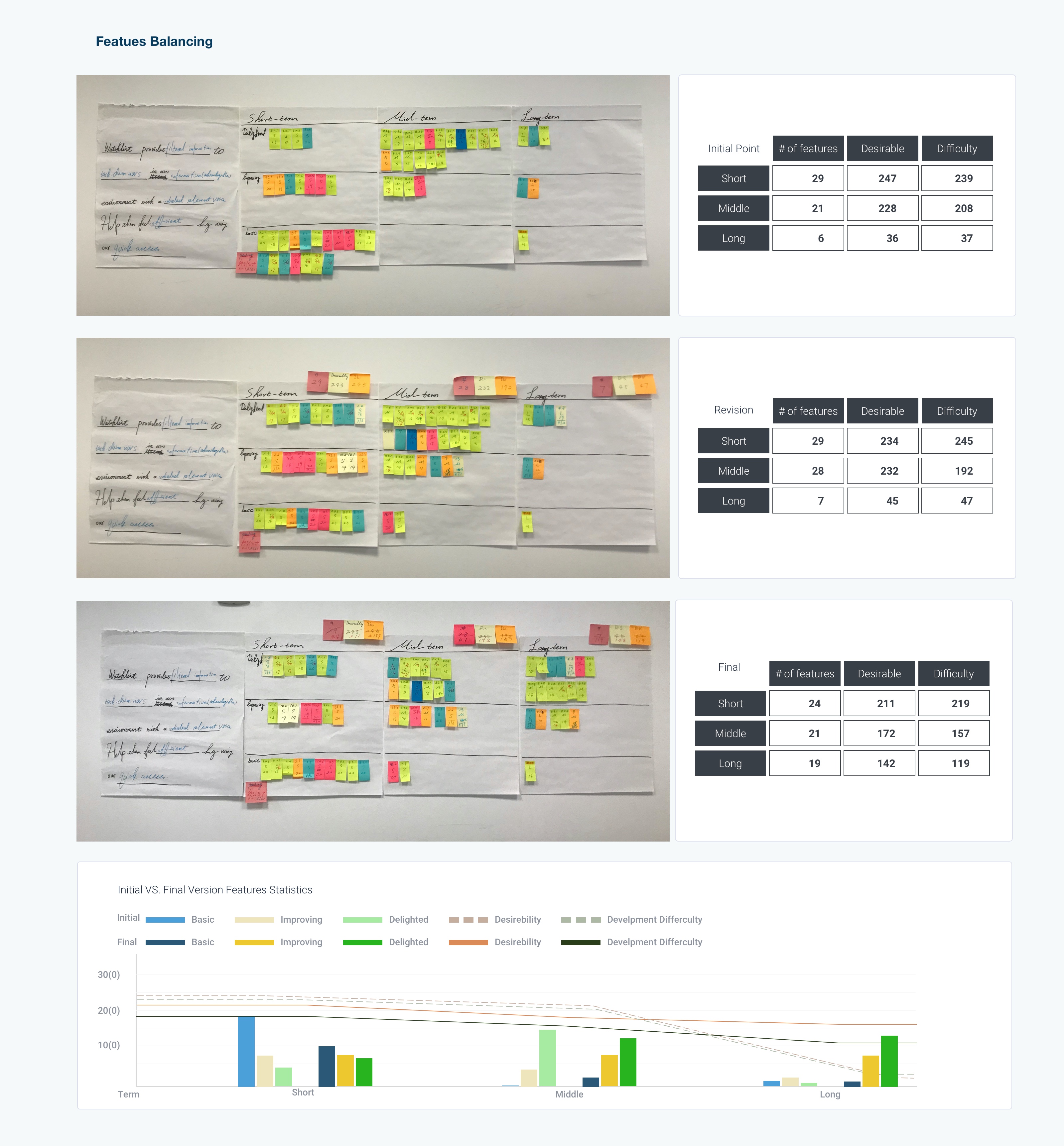 We put all these features into three terms and then balancing the number of user's desirable rating and difficulty rating. We wanted the numbers decreased linearly. Because by the end of each phase, I would facilitate user testing, some room need for iterations and modifications. In the last step, we balanced the number of basic, improving performance, and delighted features. The total number decreased linearly as well.