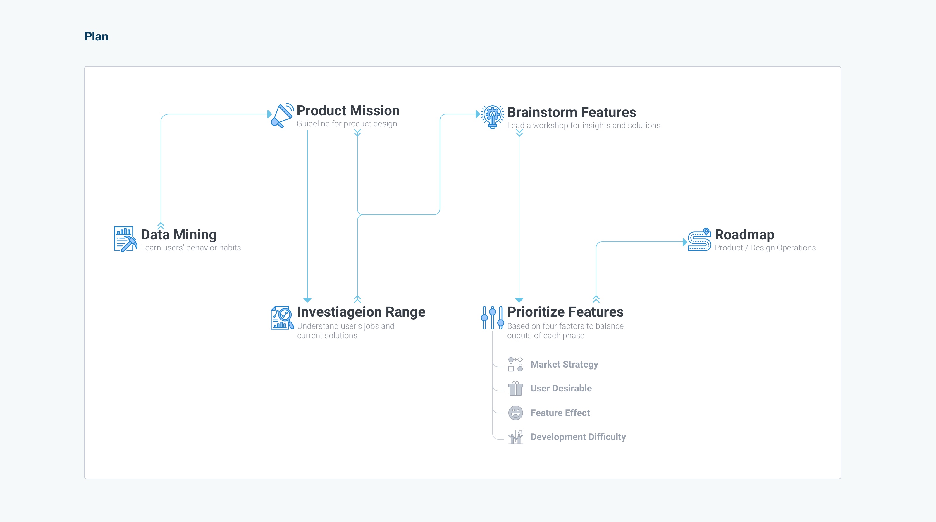 In the end, we got a roadmap having three terms. The short-term started with fundamental features right away for the next sprint. Mid-term would begin in three to six monther; we need to hold user testing to iterate the short-term design. For the long-term plan, we would focus on more innovative design features.