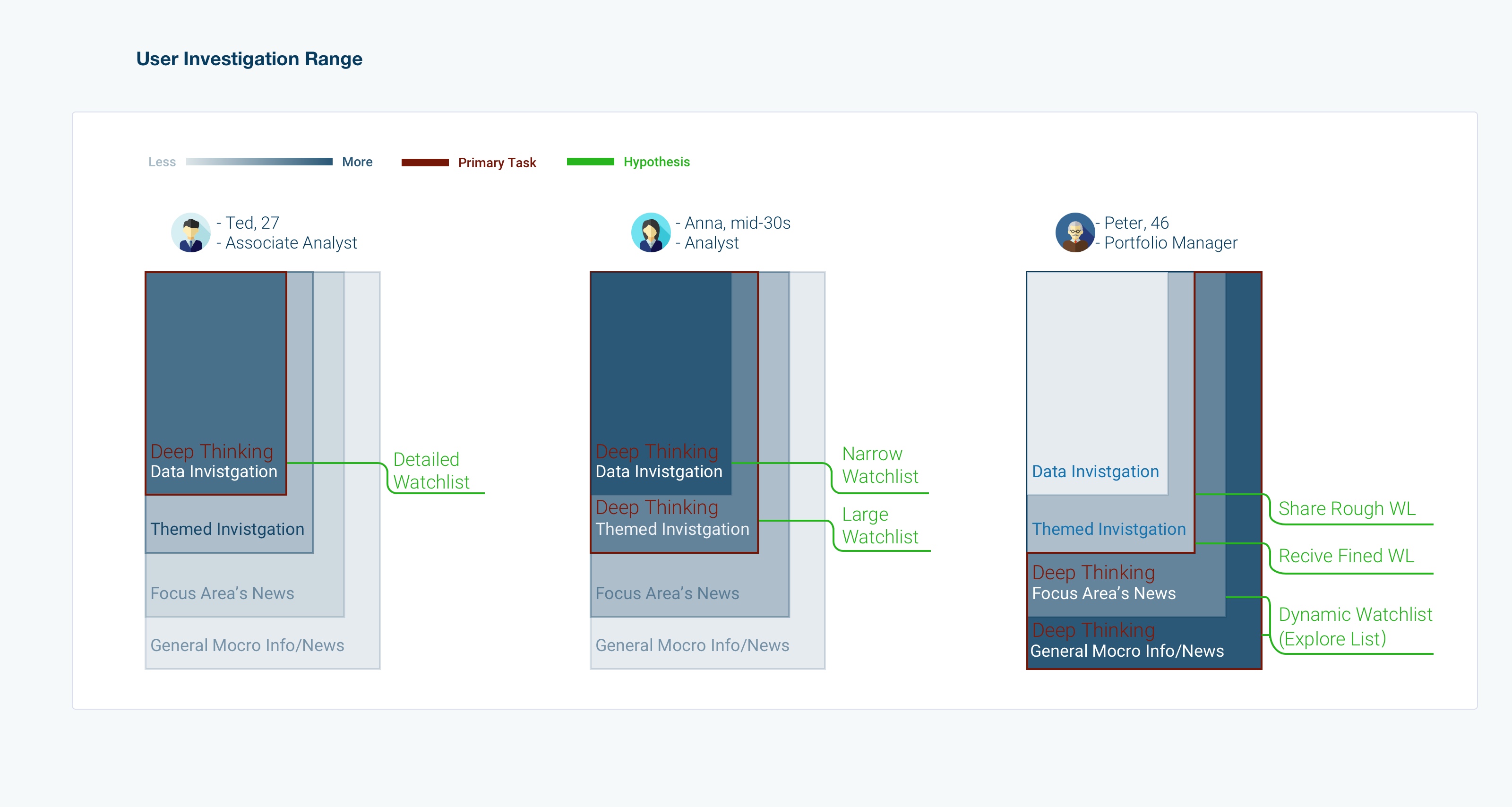 And then, we analyzed our user's archetypes. Based on these types, we listed how they process the industry's data and content very day. How did our product help them? And more important, which tasks did we not support for them?